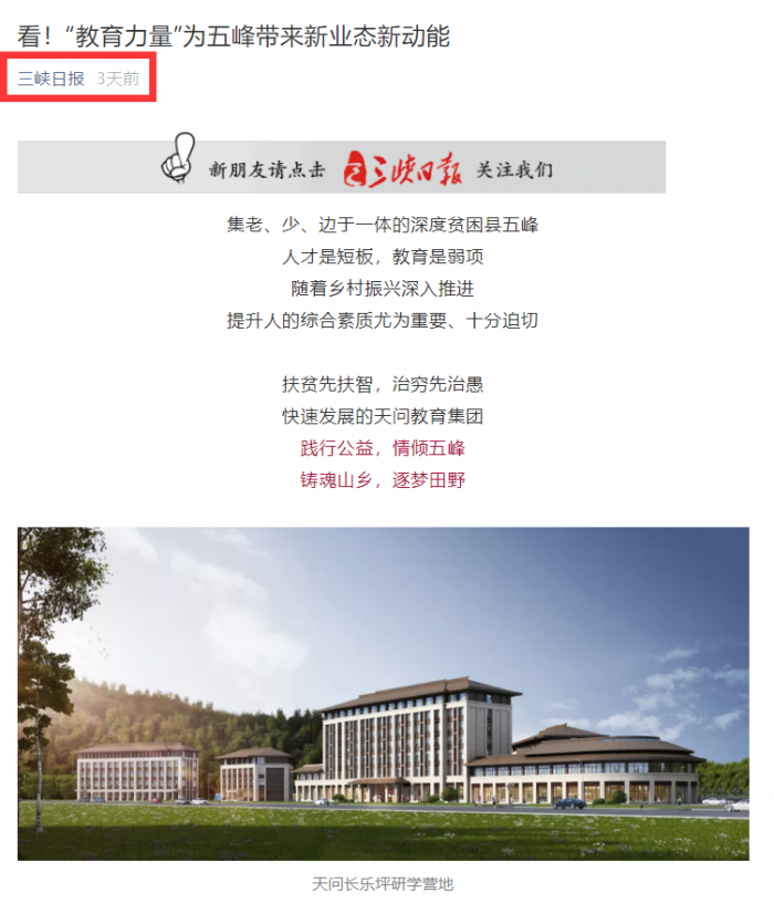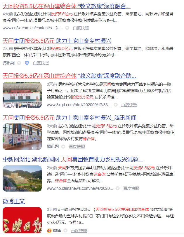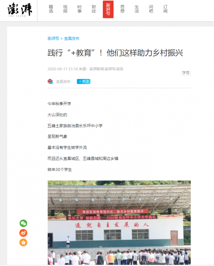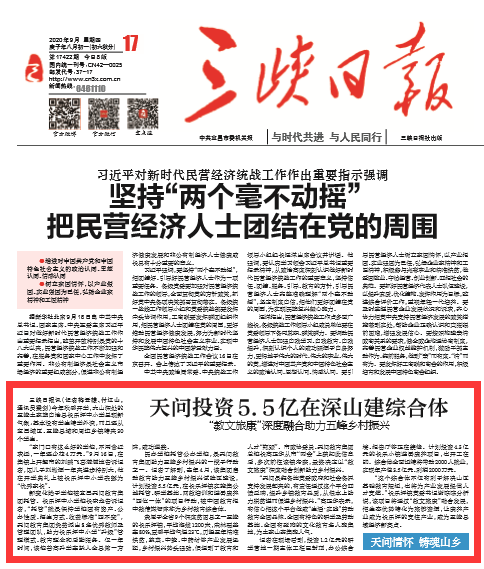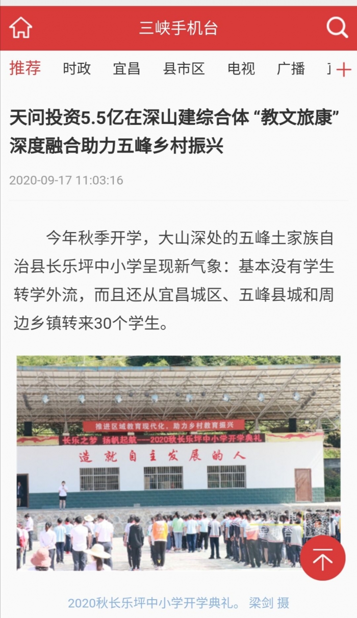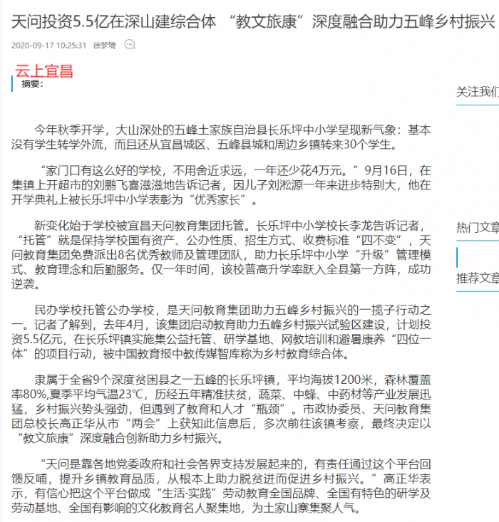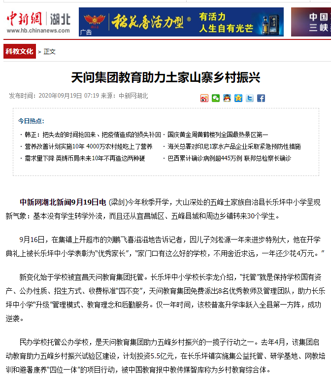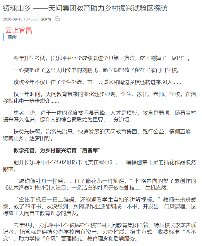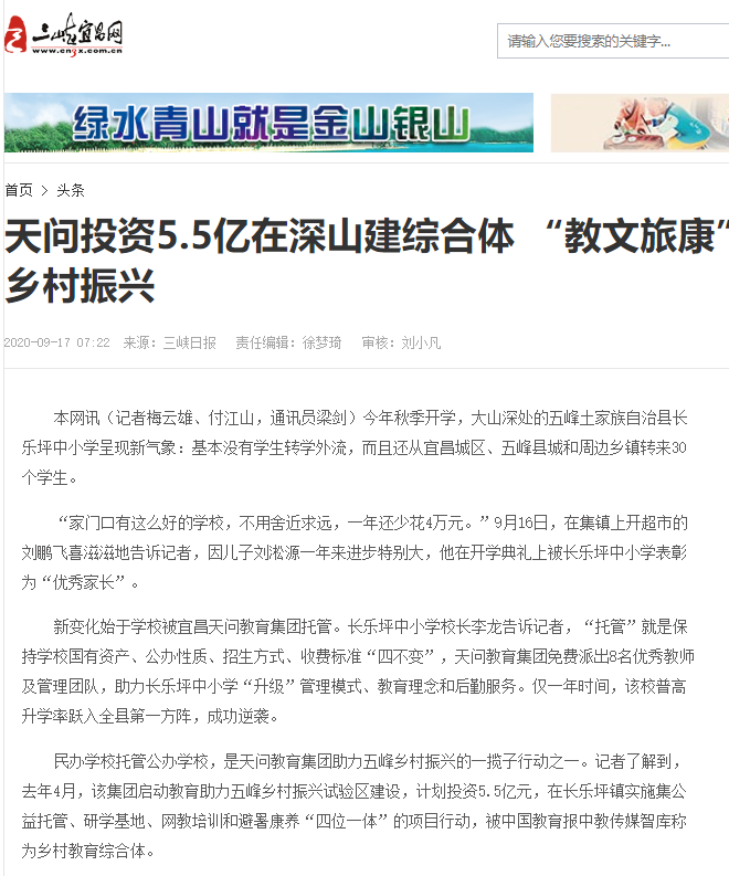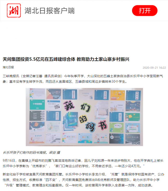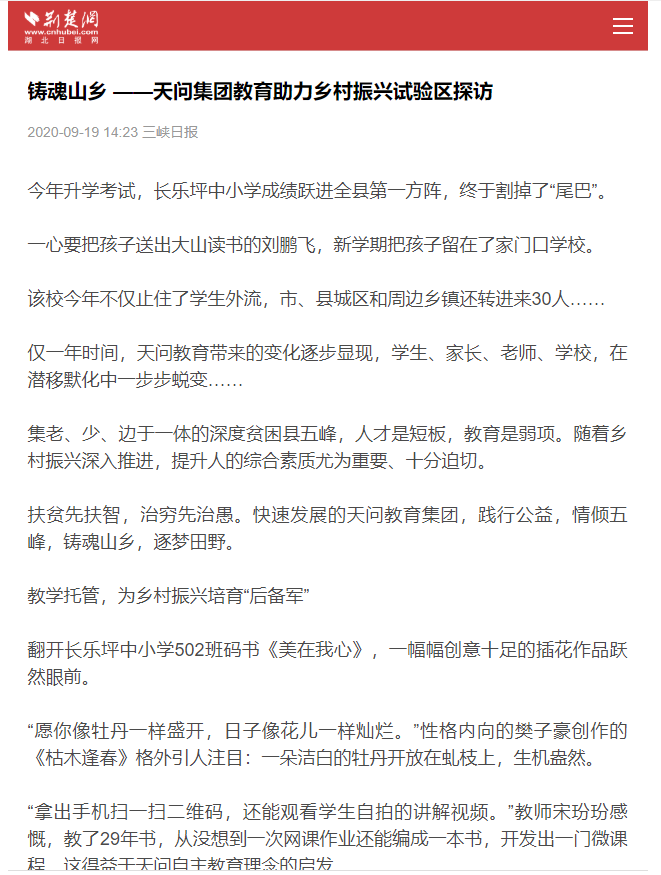 9月17日、18日三峡日报头版头条刊发“天问情怀 铸魂山乡”系列报道关注天问教育助力乡村振兴试验区建设。