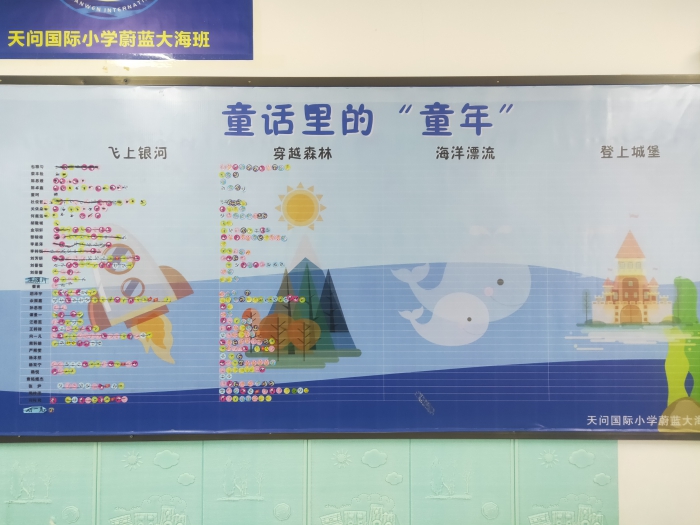 天问国际小学104班以孩子们喜欢的大海为主题设立了班级文化,班名为“蔚蓝大海”,班上一共有35名同学,每个成员都是海底探险分队小成员,老师们鼓励大家积极探索发现。