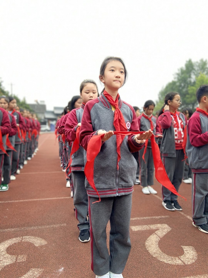 2020年10月13日,在初秋明朗而柔和的阳光中,鲜红的队旗迎风飘扬,嘹亮的少年先锋队队歌响彻了整个书院小学的校园。二三年级的孩子们在老师的带领下,整齐地列队,庄严地等待着他们人生中第一次意义重大的、激动人心的时刻——加入光荣的少先队组织。