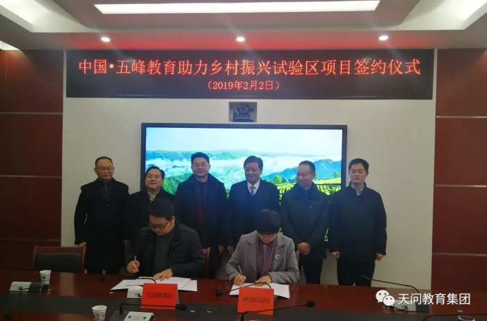 2019年2月,天问教育集团与五峰政府签订“中国·五峰教育助力乡村振兴试验区”的协议,在长乐坪镇实施集公益托管、研学基地、高端培训和避暑康养“四位一体”的项目行动,被中国教育报中教传媒智库称为“教育综合体”项目的国内首创。