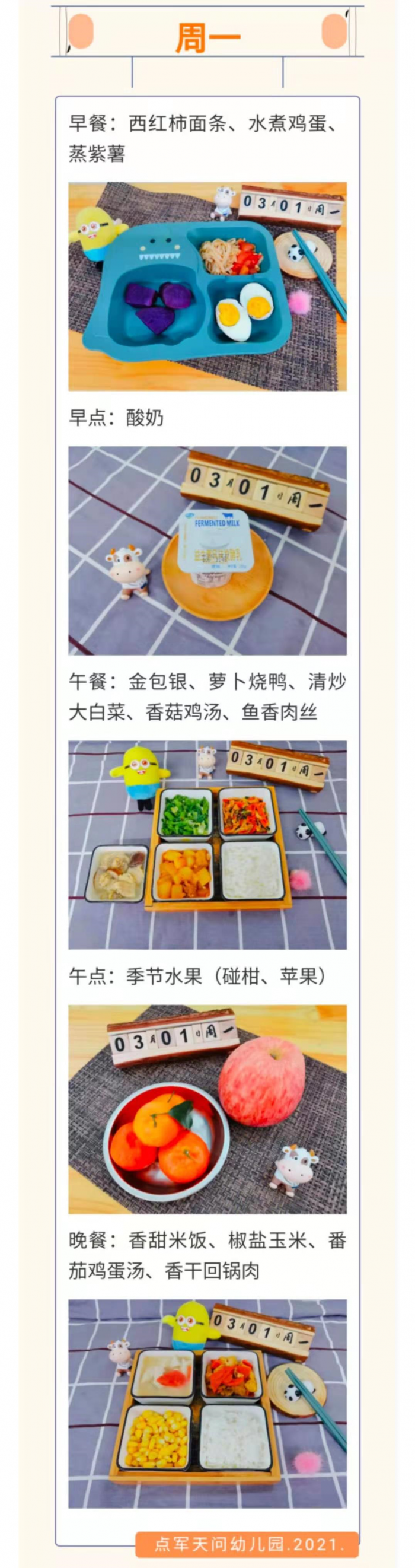 我们点军天问幼儿园遵守孩子年龄特征、身体所需营养成份,为孩子们提供定时定量,荤素营养搭配餐点。