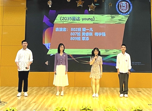 《2035是这young》《红旗飘飘》《我的祖国》《青春恰时来》《门口在过兵》《少年》……一首首洋溢着红色激情与青春气息的歌曲唱响在同学们耳畔,更唱响在了大家心头。让同学们深感祖国的伟大、党的伟大,坚定了要为祖国的繁荣富强和中国梦的实现努力学习、担负使命的决心。