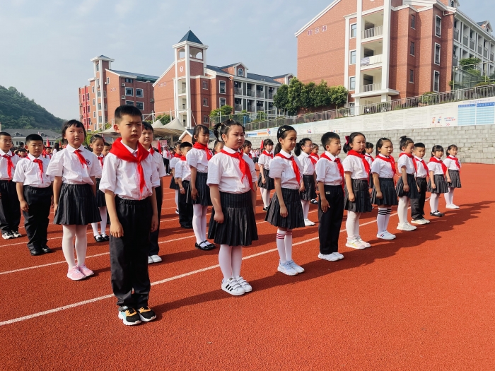 “祝贺一年级40名同学光荣加入了少先队组织。同时,祝全体同学六一儿童节快乐。”胡菲校长寄语新队员,“希望所有的队员们时刻以优秀少先队员的标准严格要求自己,继承发扬少先队的优良传统,知行合一,扎实本领,为建设我们伟大的祖国时刻准备着。”