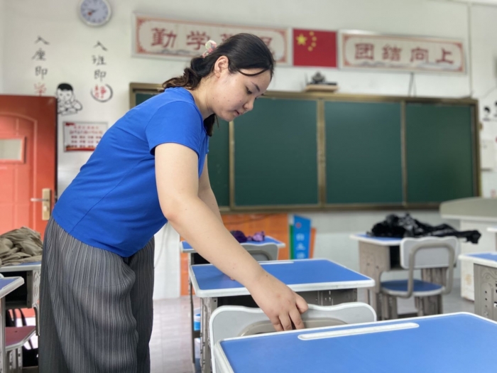 看!经过打扫完的教室一尘不染。教室里的课桌椅摆放得整整齐齐,迎接学生的到来,迎接新的学期,迎接美好的学习生活。