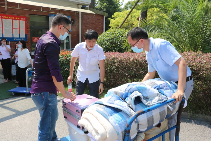 排队、测温、扫码……同学们一一进入久违的校园。因防疫要求,家长不能入校。老师们耐心的给同学们指引寝室方向,热情的帮忙搬运行李,让新同学们尽快融入校园。