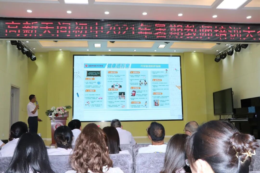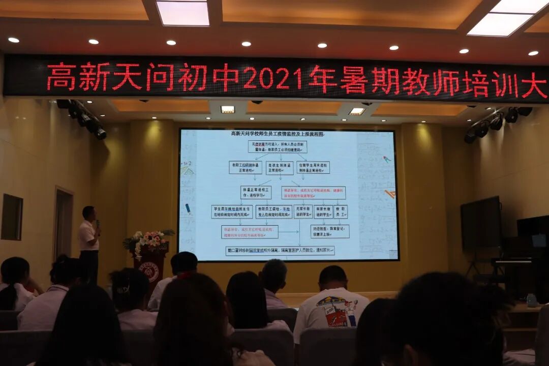 为了确保疫情演练能落到实处,8月23日下午,高新天问初中在暑期教师培训大会上,进行了疫情防控应急演练专题培训。