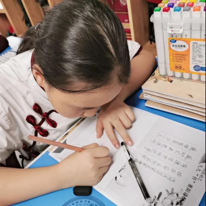 三四年级的小书宝诵菊诗,配菊画。孩子们用灵巧的双手,把爱汇入到图画中,线条的设计,色彩的配合,都展现出孩子们对重阳节的独到感悟。