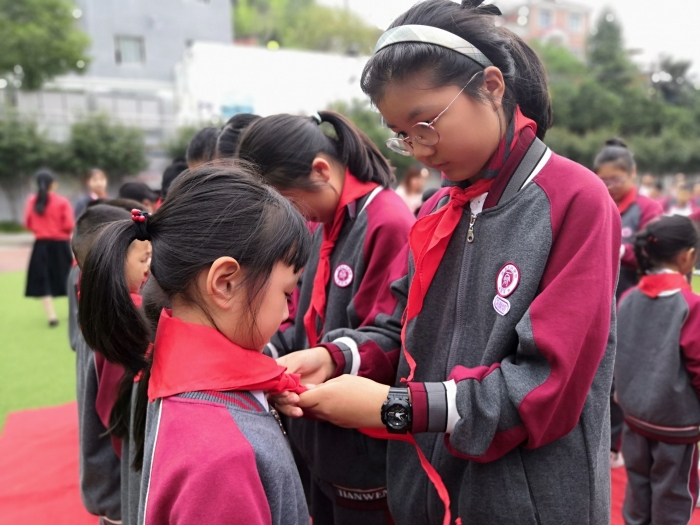 新队员在辅导员、老队员的见证下,光荣的加入了中国少年先锋队,成为了一名少先队员。新队员从老队员手中接过领巾,老队员协助新队员系在胸前,不仅增强了仪式感,更与新队员一起体验、成长!