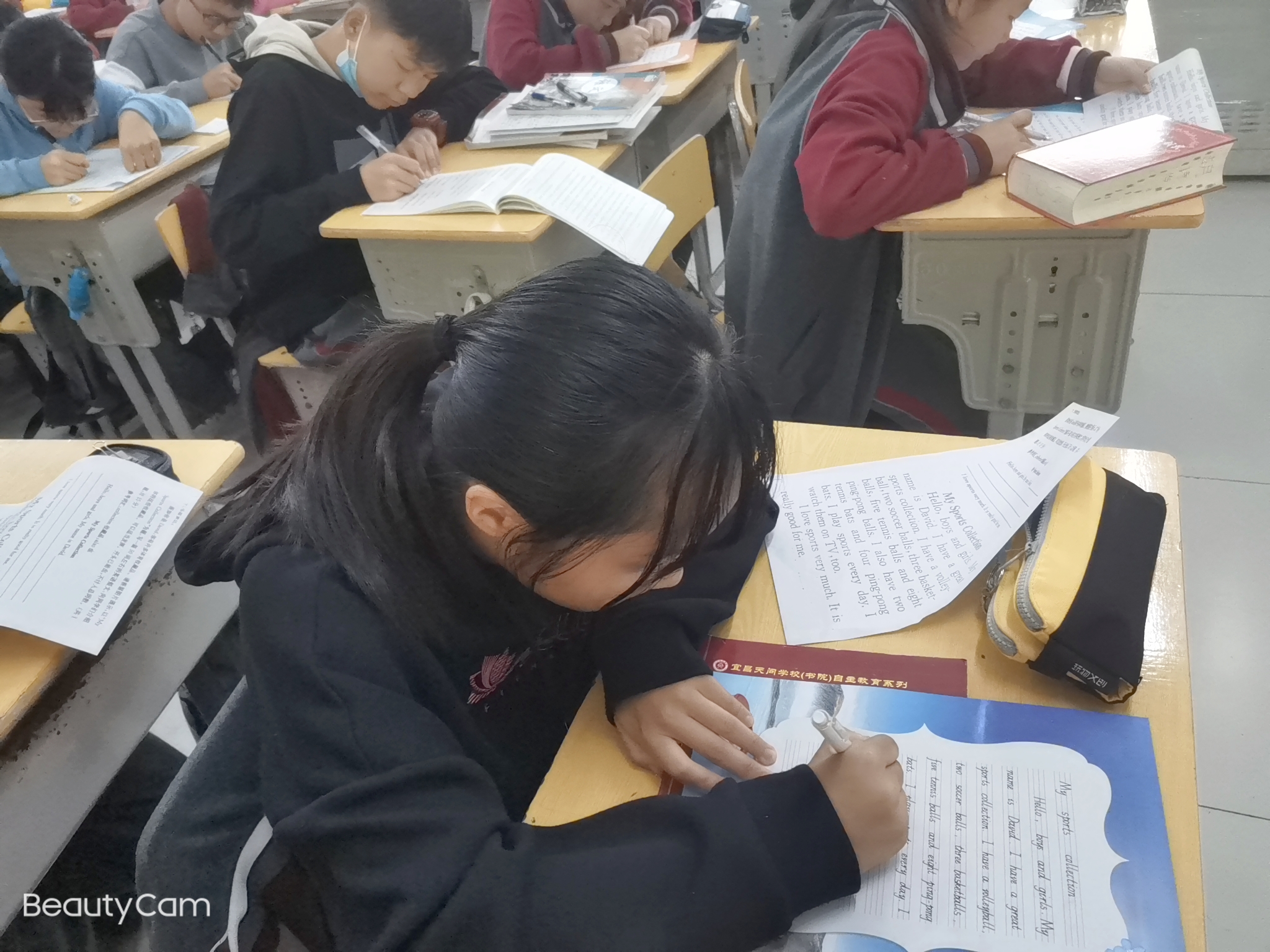 此次比赛以班级为单位,在各班教室统一进行。在比赛过程中,同学们都坐姿端正,按照要求规范书写,不仅展示扎实的英语书写功底,还表现出极大的热情和认真的态度,卷面干净整洁、书写流畅秀丽的英语作文跃然纸上,令人心旷神怡。