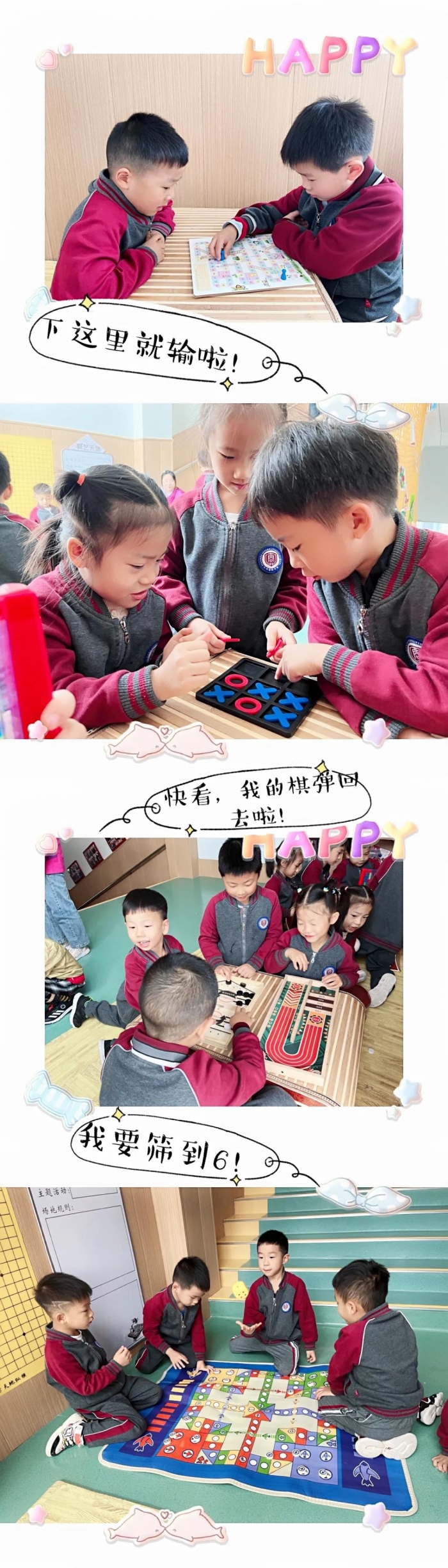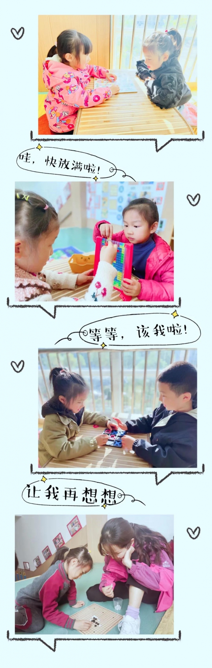 在幼儿园里有一方“小棋摊”,这里聚集了很多爱下棋的小朋友和一些“棋艺高手”,在这里不仅能交到好朋友,还能开发智力、训练思维,培养仔细观察、认真思考的习惯呢!