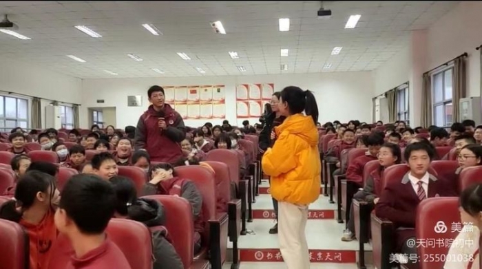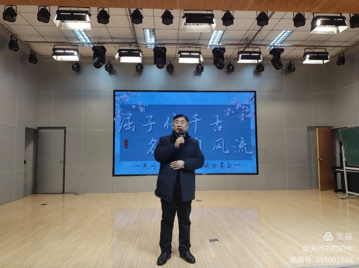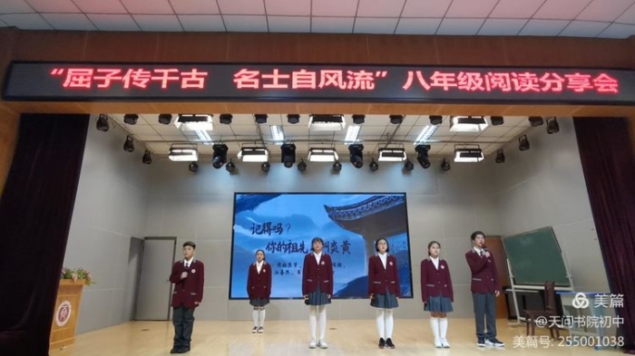 为培养学生的阅读素养,促进学生积极思维、有效表达,营造良好的经典阅读氛围,1月6日,天问书院初中八年级举行了“屈子传千古 名士自风流”读书分享活动。天问书院名誉院长顾景荣、天问书院初中校长彭灿、课程中心主任李孝明、校务中心主任李晓波、德育处主任陈飞出席活动。此外,活动还邀请了小学部六年级学生代表到场观摩。