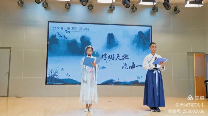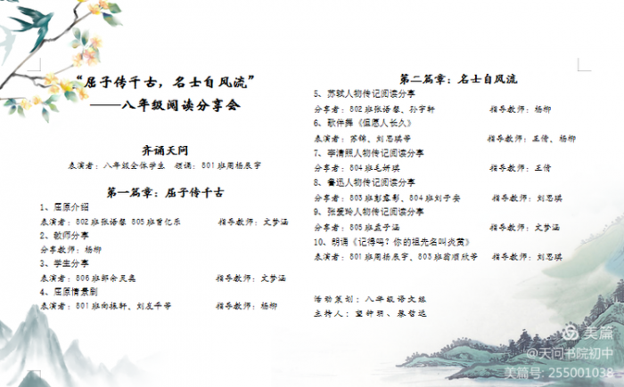 “上下未形,何由考之?冥昭瞢闇,谁能极之......”。阅读分享活动在八年级全体同学洋洋盈耳、抑扬顿挫的齐诵《天问》声中正式拉开帷幕。