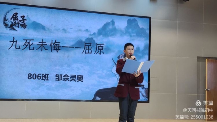 “伟大并不意味着遥远,伟大在我们和他的诗之间......”在精美的PPT、悠扬的旋律的助力下,802班张语馨和805班曾亿乐同学娓娓道来,为全场师生介绍了屈原浪漫而又坎坷的一生。
