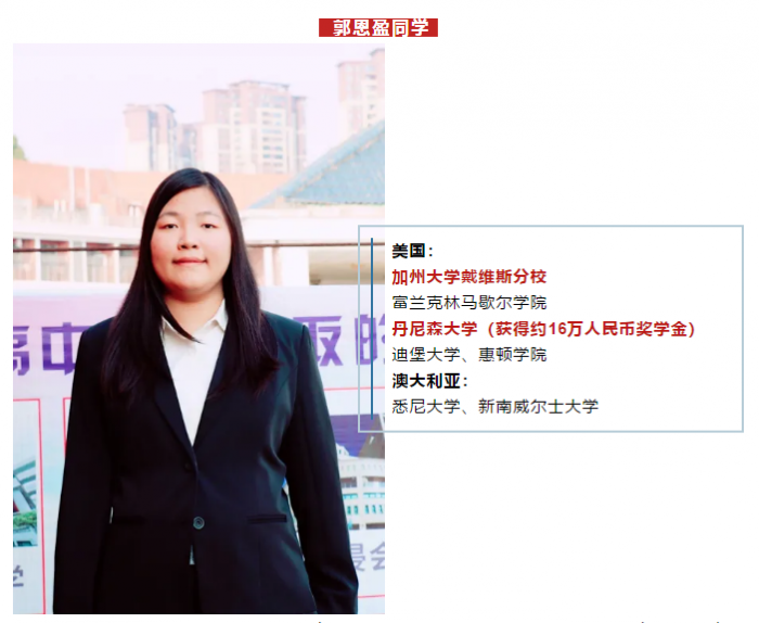 近两年来,美国加州系大学持续缩减国际生录取比例,录取要求水涨船高。郭恩盈仅用雅思6.5分,凭借着极具竞争力的社会实践经历和对心理学专业知识的深厚积累,逆袭斩获了美国排名第38的加州大学戴维斯分校录取通知书。