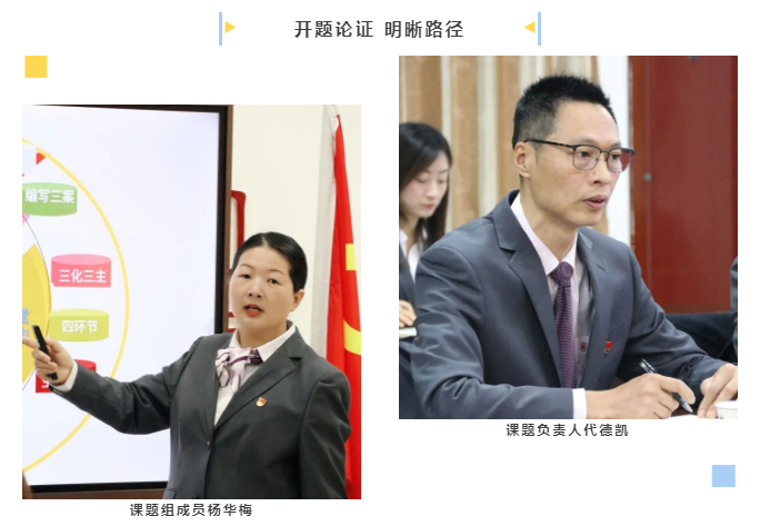 《中小学党建基地的研究(校内、校外)》课题负责人代德凯、《“生活·实践”教育理念下学生自主力培养实践研究》课题组成员杨华梅分别代表课题组围绕课题的问题提出、核心概念界定及理论依据等六个方面作开题报告阐述。