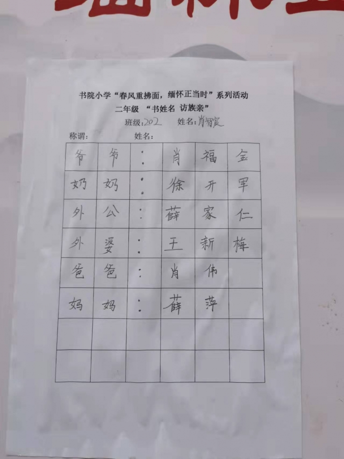 四月,天问书院小学开展了“清明寻根问祖”系列活动。学校为孩子们准备了特殊的清明节“作业”,孩子们在作业中崇德尚孝,感受中国传统文化的内涵,让优良传统美德扎根于书宝的心中。一年级:书姓名 绘家亲;二年级:知来历访族亲;三年级:观旧照忆往事;四年级:闻家史理族亲;五年级:怀先祖传家训;六年级:观家谱承家宝。