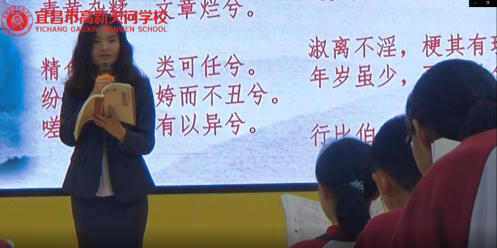 老师带领同学们一起诵读屈原诗歌《橘颂》,还为诵读配备音乐,语调铿锵有力,荡气回肠,诗境颇浓。