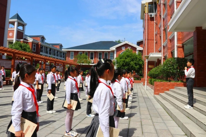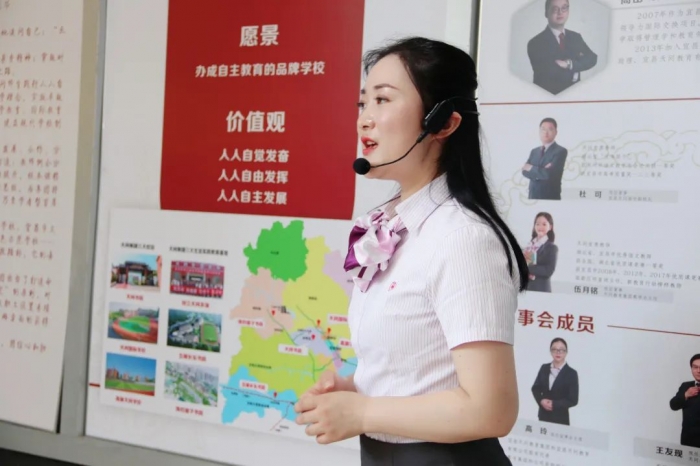 高新天问小学校长胡菲向调研组介绍了天问的校徽校训、集团三校三基地建设,及屈原文化构建的系统性内容。