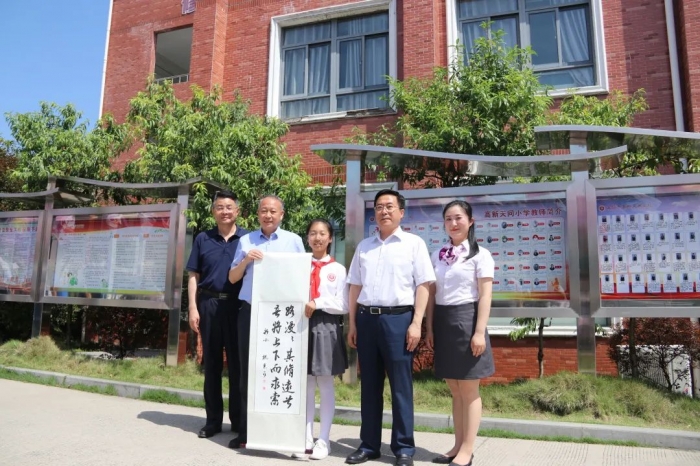 最后,高新天问小学604班学生魏奕可将自己书写的书法作品“路漫漫其修远兮,吾将上下而求索”送给了调研组。
