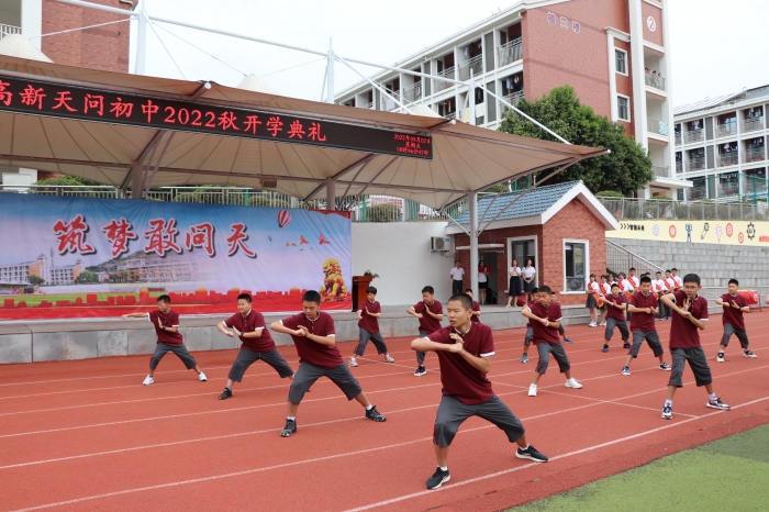 七年级新生,为我们带来了军体拳全表演。一招一式,英姿飒爽,证明了他们的壮志豪情展也现了新初学子“敢问天”的闯劲和拼劲。
