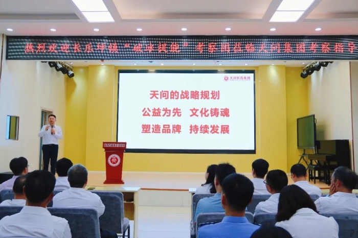 “公益为先,文化铸魂。天问自主教育的目标是造就自主发展的人。” 天问教育集团党委书记、总校长高正华为嘉宾们介绍了天问的发展历程、办学理念、今后的发展方向,并对天问集团的现代学校管理制度动力系统、保障系统、发展系统,以及天问自主教育体系的生成与深入开展等内容进行了详细的讲解,让大家充分了解到天问集团“人人自觉发奋、人人自由发挥、人人自主发展”的价值观和“造就自主发展的人”的使命。