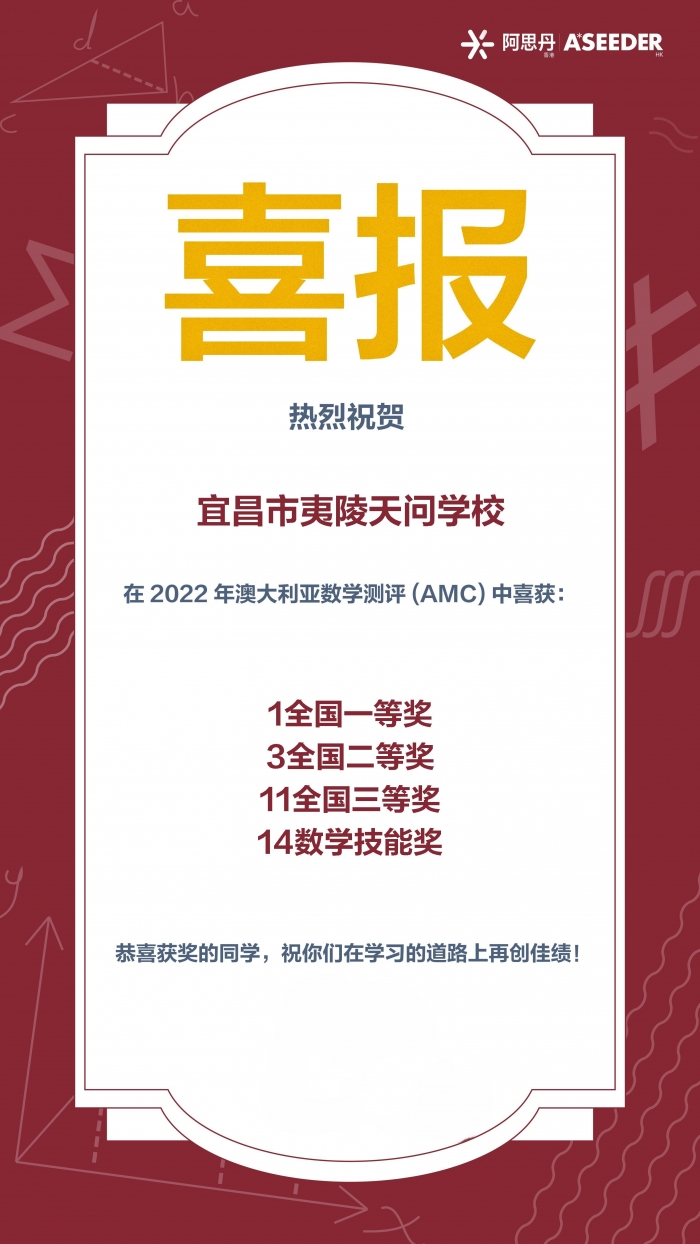 近日,天问国高学子在2022年澳大利亚数学测评(AMC)中取得优异成绩,斩获1个全国一等奖,3个全国二等奖,11个全国三等奖,14个数学技能奖。高一王东朔同学荣获全国一等奖!