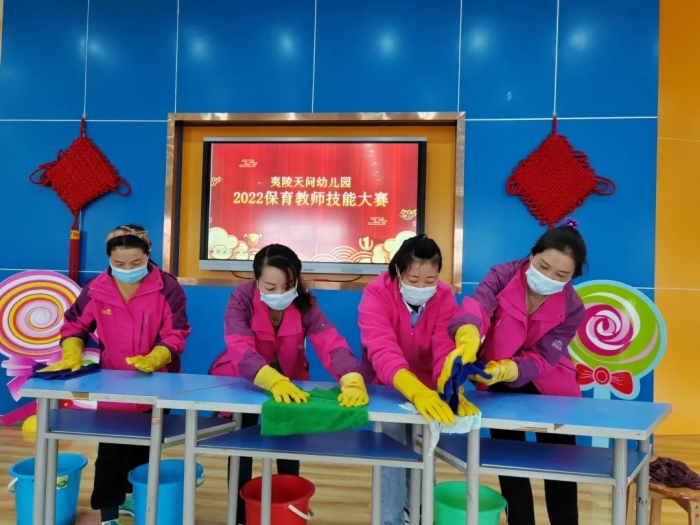 为了不断提高幼儿园保教质量,提升保育员的工作技能和综合素质,树立科学的保育观,促进幼儿一日生活管理科学化、规范化、精细化,真正做到“保教结合,教养并重”,夷陵天问幼儿园开展了“展技能,亮风采,促规范”保育老师技能大赛。本次保育员技能比赛采用理论与实践相结合的形式, 比赛内容由“理论知识测试”和“实际操作”二个部分组成。让我们跟随“镜头”一睹她们的风采吧。