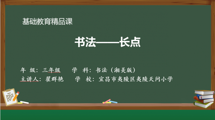 翟群艳老师执教的湘版《书法》教材三年级下册第一课《长点》,在教育部基础教育精品课遴选活动中,被评为教育部部级优质课,也是宜昌市唯一一节书法部级优质课。