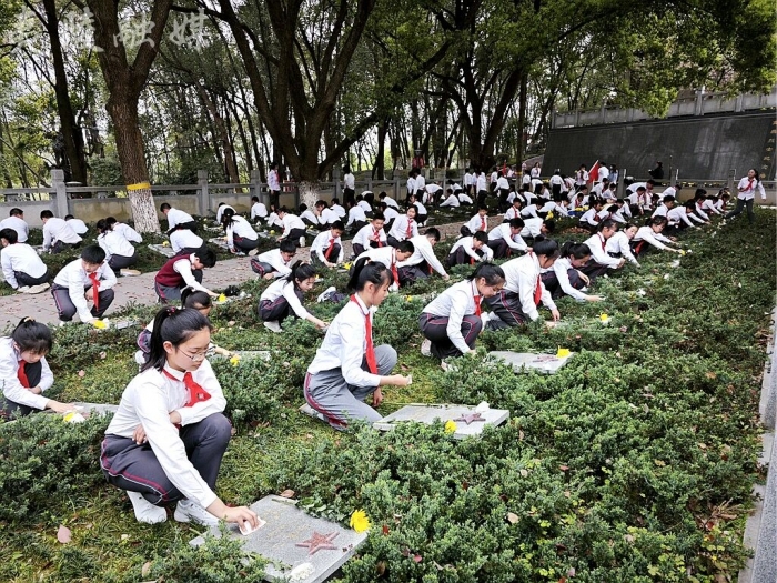 烈士陵园中心广场上,气氛庄严肃穆。革命烈士纪念碑前,同学们整齐肃立,奏唱《中国少年先锋队队歌》《在烈士墓前》。学生代表向革命烈士敬献花篮,并集体向烈士行三鞠躬礼,寄托对烈士的无限哀思。在革命先辈们注视下,一年级的小同学们光荣加入中国少年先锋队。他们举起稚嫩的右手,说出如先辈般坚定的誓言。现场学生还齐声诵读《少年中国说》,继承先辈遗志,争做新时代好少年。