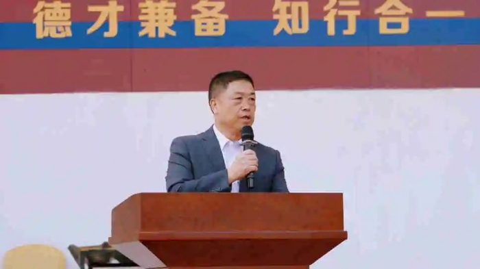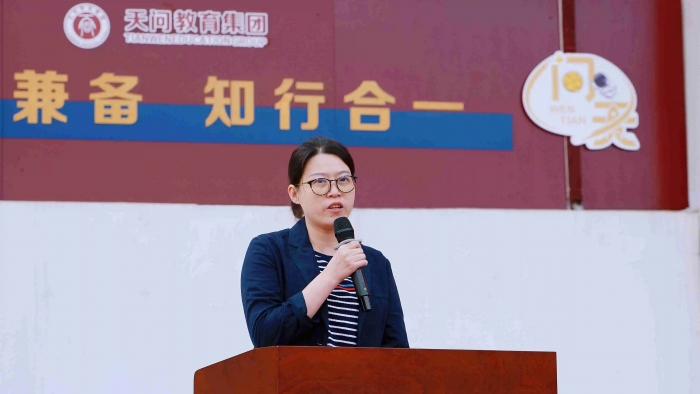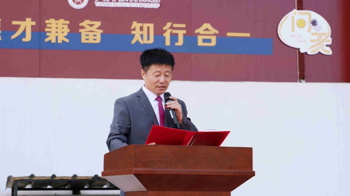 天问高中部王少斌校长讲话。他说,在美丽的长乐坪千米高地,我们有信心打造一个乡镇优质教育高地,我们有信心创造学校品牌,打造品牌学校。在这个教育生态与自然生态的校园里,我们聚一批能人,就一定能办好一方教育,服务一方百姓,成就一代孩子。