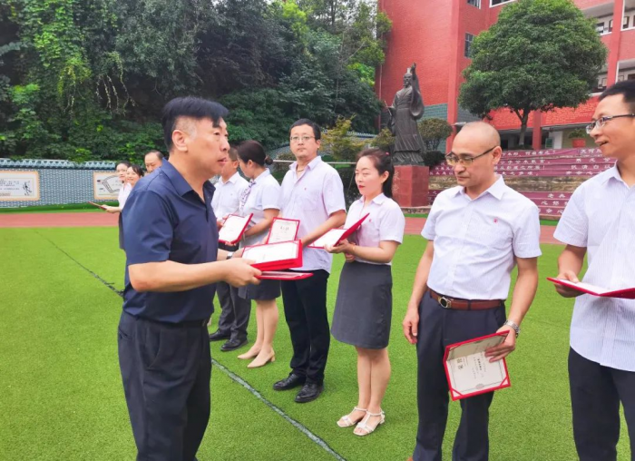 活动中,天问教育集团党委副书记、点军天问书院学校党支部书记代德凯同志宣读2023届卓越贡献奖教师名单,天问教育集团工会主席姚太权、点军天问书院学校名誉院长顾景荣、点军天问书院学校校区兼天问书院-28中教联体执行校长彭灿为老师们颁奖。