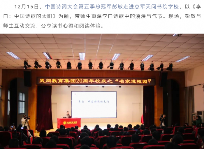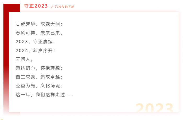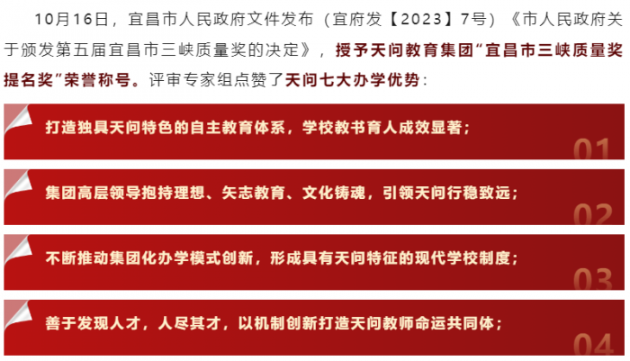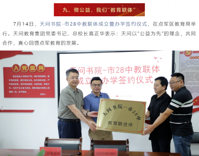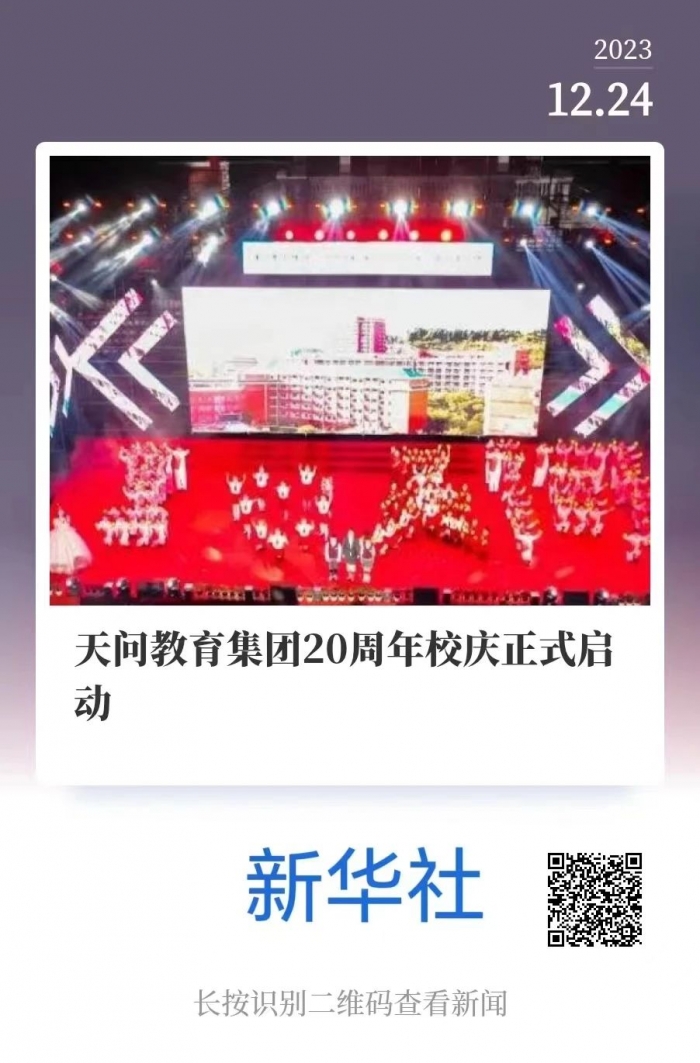 3月1日,教育部基础教育司原副司长郑增仪、全国民办教育协会秘书长周俊等专家莅临调研;3月3日,三峡旅游职业技术学院党委副书记朱昌林等专家莅临夷陵天问幼儿园;8月1日,香港特区政府主办的香港青少年交流团到访天问,与国际高中师生互动交流;10月18日,日本三重县铃鹿市政府青少年代表团来校与天问高中举行友好交流活动。3月22日,天问国际高中与塞浦路斯PASCAL教育集团签订合作意向书。集团及各学部全年外来参观来访共计2777人次。 20周年校庆主题曲《天问天下》,校庆Logo、吉祥物、纪念币等系列文创正式发布,深受师生追捧。宜昌市文联主席周立荣为校庆主题歌作词并出席现场活动;校庆Logo由书小301班陈相彦池设计,吉祥物由夷小401班高瑞泽设计。 集团20周年校庆启动仪式的三屏互联,直播观看超过100万人次。湖北日报、三峡日报、三峡电视台、荆楚网、今日头条等26家省市主流媒体纷纷报道。其中,国家通讯社——新华社发稿,振奋人心,阅读量超过100万+。