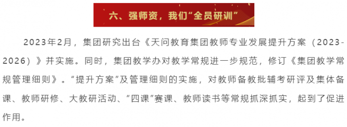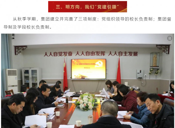 春季学期,集团党委根据上级组织有关规定,按照既定程序,落实“建立中小学校党组织领导的校长负责制”,各校区党支部班子成员得到合规调整。9月,集团印发《天问集团督导室工作方案》,明确了督导室职责、工作方式和原则、工作成员等,并开始展开督导工作。从新学期开始,凡有多校区的同学段学部,采用大校长负责制,做到政令畅通,统一指挥。