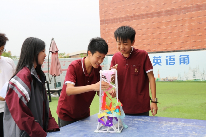 在最激动人心的测量环节,答案即将揭晓,量高度,测承重,同学们屏住呼吸,慢慢的将一本本书放上纸塔,每次成功后,现场就会爆发一阵阵欢呼。当然也有只注重外观的小组,将纸塔设计成精美的小鸟形状,导致无法承重让大家惋惜不已!
