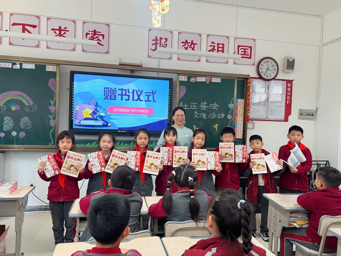 张静书记强调青少年法制教育是全民普法的重要一环,希望同学们不仅认真学习法律知识,更要将其作为日常生活的标尺,用以规范自己的言行,在成长的道路上,能够不断增强自我保护意识和能力,健康平安地成长。随后,张静书记为学生们赠送了《民法典》漫画书和《安全长大》安全教育小百科等法律相关书籍。