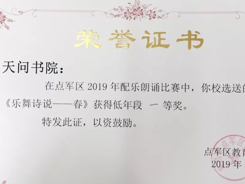 最美的四月天。4月初,点军区举行了“诵读经典,润泽心灵”配乐朗诵比赛。天问书院小学选派一年级和五六年级分别参加低年组和高年组参赛,均荣获点军区一等奖。