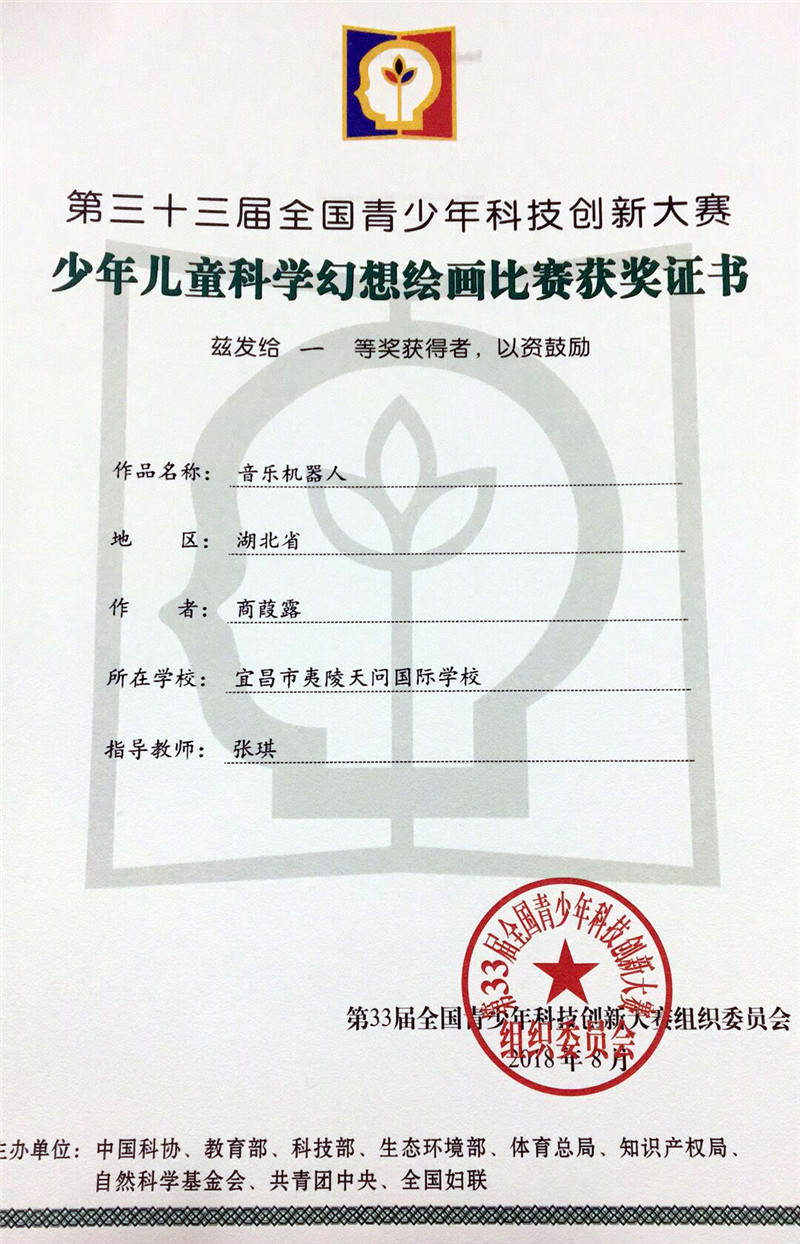 近日,从第三十三届青少年科技创新大赛组委会获悉,天问国际初中802班商葭露同学创作的科幻画《音乐机器人》,荣获第三十三届全国青少年科技创新大赛少年儿童科学幻想绘画比赛一等奖,该作品先后在宜昌市和湖北省青少年科技创新大赛中获得一等奖。