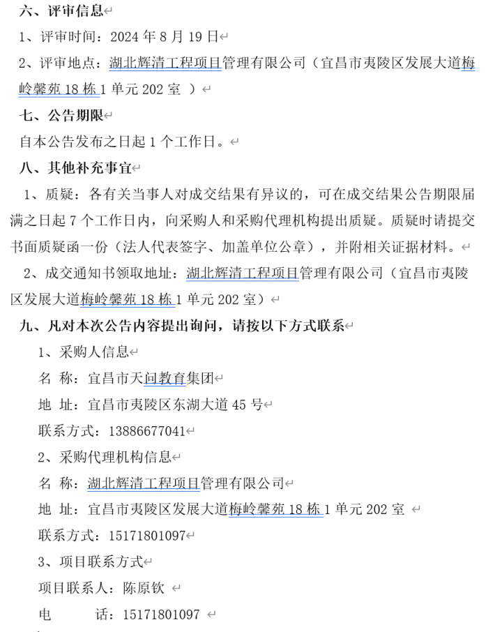 宜昌市天问教育集团2024-2025年度食材供应服务采购项目成交结果公告