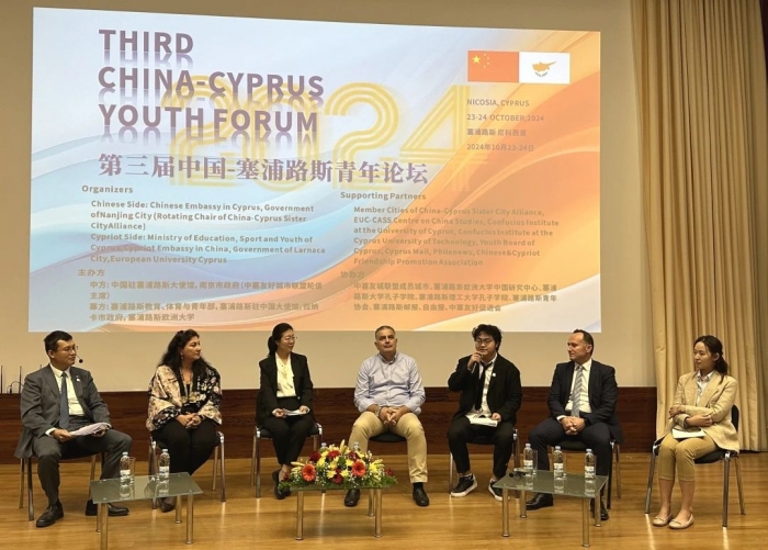 10月22日至25日,驻塞浦路斯使馆联合中塞友城联盟轮值主席南京市政府、塞教育部、拉纳卡市政府、塞欧洲大学、塞驻华使馆等成功举办2024年中国-塞浦路斯青年交流周暨第三届中塞青年论坛。来自南京、青岛、宁波、广州、西安、福州、渭南、宜昌、新疆9省市及来自塞政党等各界别青年代表60余人围绕文明互鉴、数字转型、绿色发展分议题深入交流,并发布《中国-塞浦路斯青年尼科西亚宣言》。