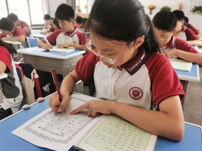 用心写字,字自有灵。比赛中,同学们坐姿端正,运笔沉稳,屏息凝神下笔,起笔,顿笔,提笔,挥洒自如,尽显笔锋。在这一张一弛之间在这一抑一扬之间,铅墨丝丝浸染着纸张,字形盈盈展现着优雅,汉字之韵就在这其中流淌。