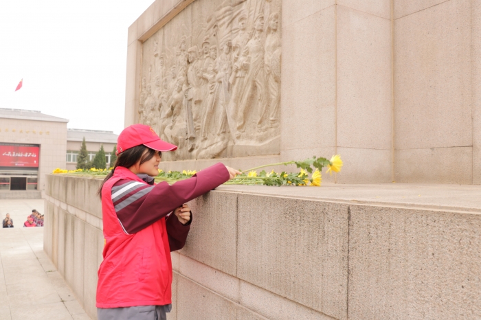 在庄严肃穆的氛围中,师生齐声奏唱国歌,随后默哀一分钟,以表达对革命先烈的深切缅怀与崇高敬意。在聆听了一段段感人至深的烈士事迹后,大家怀着崇敬之情瞻仰纪念碑,并献上鲜花以寄托哀思。