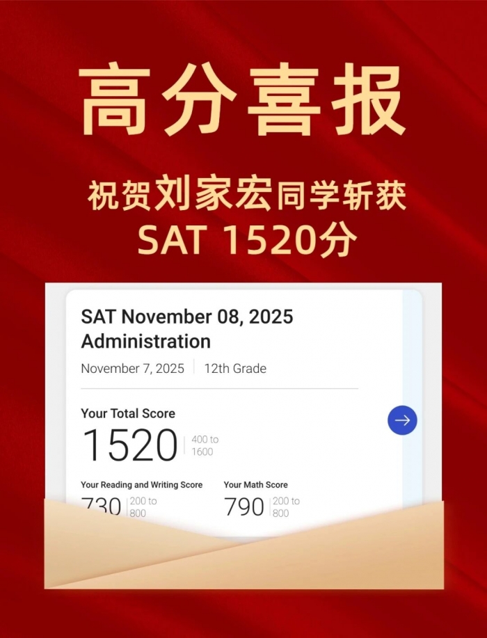 从扎实搭建基础知识框架,到针对性突破关键知识技巧;从考前一对一专属冲刺辅导,到细致入微的陪考复盘——学校以 “量身定制” 的教学模式,全程陪伴、全方位护航,让每个学生的潜力都能得到最大化挖掘。针对SAT考试,李筱波、方丹丹老师对学生的每一篇习作都会进行精细批改,从文章结构、论点论证到词汇语法,进行全方位打磨;王茜瑞老师则精准把握中国学生数学优势,开展专项拔高训练,助力两位同学在SAT数学部分斩获近乎满分的优异成绩,成为总分冲刺的 “强力引擎”。