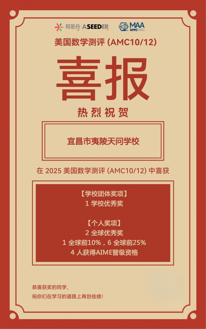 近日,2025年美国数学测评(AMC10/12)成绩揭晓。在王茜瑞老师的悉心指导下,天问国高学子在此次国际性数学测评中表现优异,集体斩获多项重量级荣誉,在全球众多参赛选手中脱颖而出!