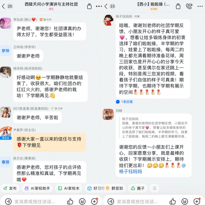 尊重兴趣,方能让热爱生根。学校前期开展社团意向调研,精准捕捉孩子的兴趣方向,再通过现场招募为孩子们搭建邂逅热爱的平台,多样社团藏着无限惊喜,让每个孩子都能找到属于自己的成长赛道。为打通课堂与家庭的衔接通道,学校组建专属社群,让孩子的成长轨迹清晰可寻,家校携手为成长护航。