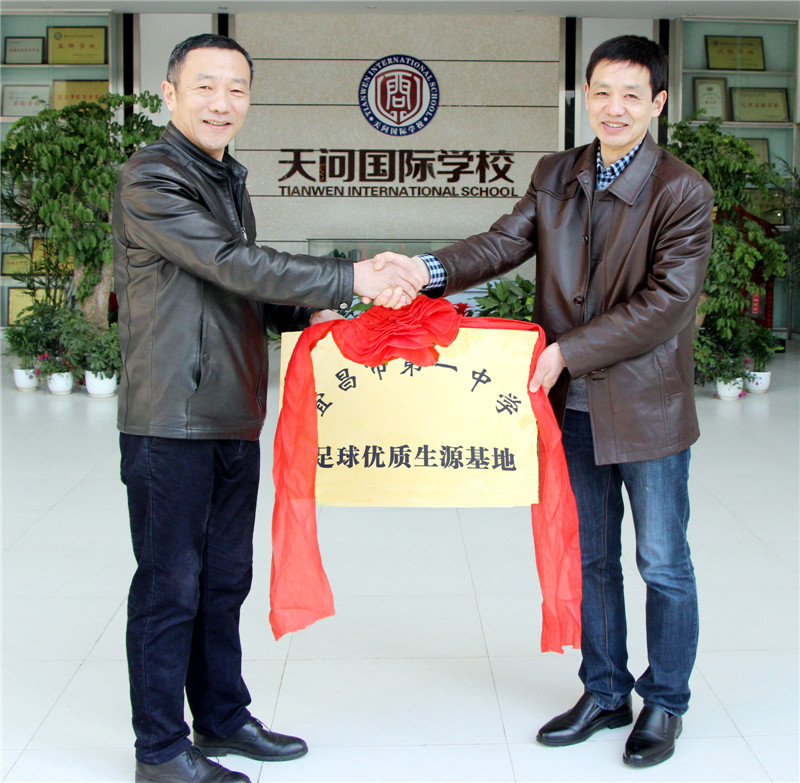 3月18日,宜昌市第一中学副校长李大海带领3位体育老师来到天问国际初中,与学校领导及体育老师进行了座谈,并将“宜昌市第一中学足球优质生源基地”铜牌授予天问国际初中。