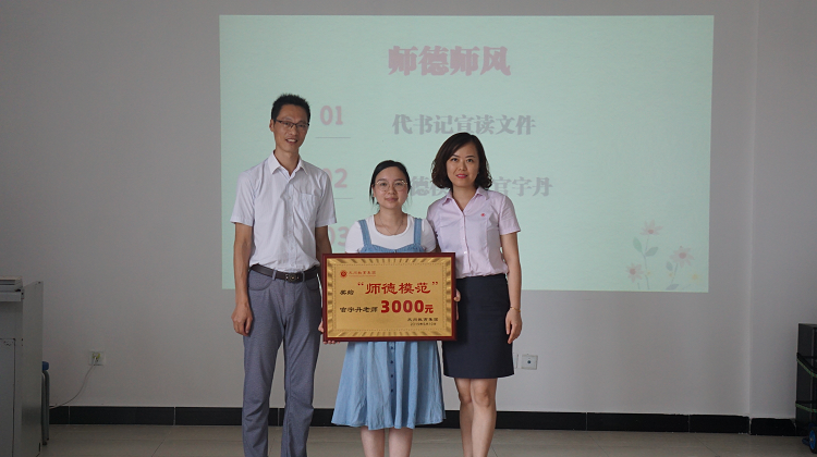 国将兴,必贵师而重负。我们作为一名老师在感受学生对我们尊敬的同时也要遵守师德师风,今天,天问教育集团党总支书记戴德凯先生为我们宣读集团文件,并和高新校区党支部书记韩亚飞老师共同为“师德模范”官宇丹老师颁奖。