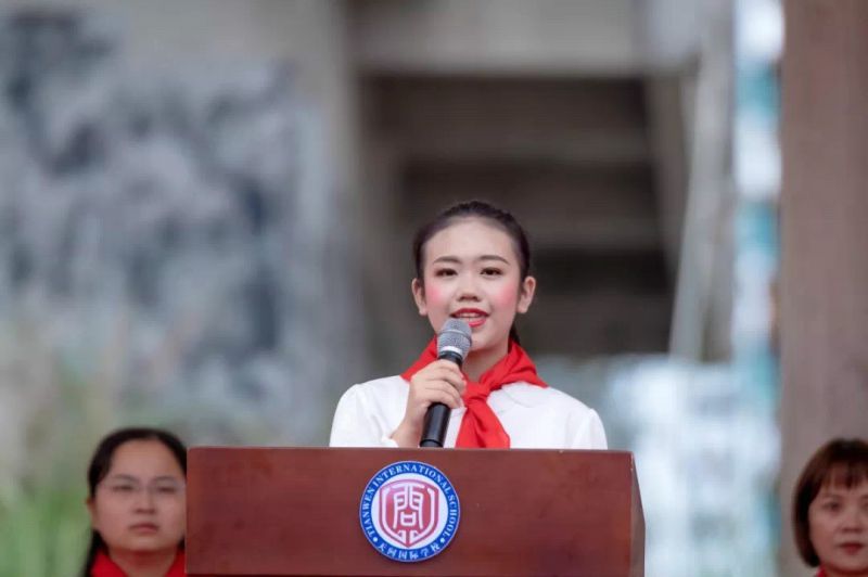 在操场集结完毕后,全体师生起立,齐唱国歌和《中国少年先锋队队歌》。国歌和队歌的伴奏均由天问教育集团管乐团现场演奏,他们以完美的演绎和昂扬的仪态,成为展演中一道亮丽的风景线。
