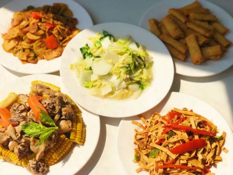 海带排骨汤、玉米烧鸡、肉糜豆腐、韭菜炒豆芽、宫保鸡丁、炕土豆片……素食与肉类完美组合,一日三餐不重样,干净卫生,口味鲜香,厨师们在极致追求理想的道路上从未停歇。