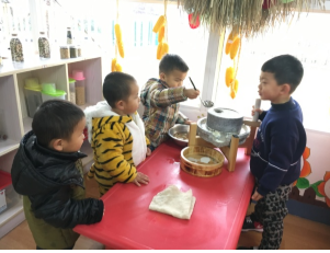 将特色融入到各个区角,根据近期内容进行设计,为幼儿提供相应的材料、教具。如小班初期美工区画石磨,认识豆子期间,拼豆子画;建构区拼搭、设计新型石磨;益智区研究石磨原理等。中班了解土家族建筑、制作更难的食品,大班走进民俗博物馆,开展美食节等活动。幼儿在这些活动的实践操作中,满足他们动手、动脑、动口的需要,提升合作能力、自主探索研究的能力。