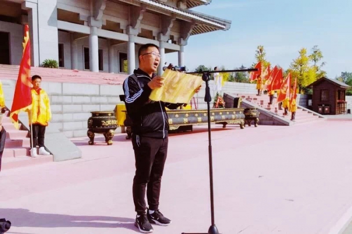 穿过九孔桥,师生在大殿前的广场上庄严肃穆地举行祭祖仪式。伴随击鼓九通,鸣钟九响,袁校长敬上高香,孙主任读祭文,“烈山苍苍,姜水汤汤。愿我先祖,恩泽绵长。奉祀于兴,利在攸往。颐冀来年,圣光再仰!”面面旌旗卷舒招展,昭昭赤子之心激荡,全体师生一起向中华民族的人文始祖鞠躬行礼,祈福国家繁荣昌盛,祈愿莘莘学子弘扬民族精神,励精图强,铸就书小辉煌!